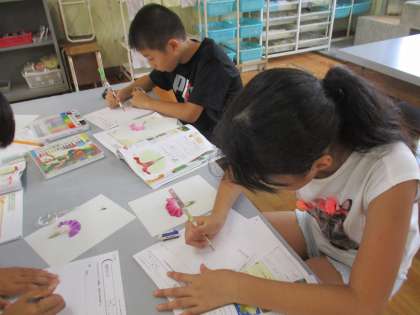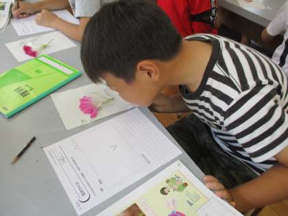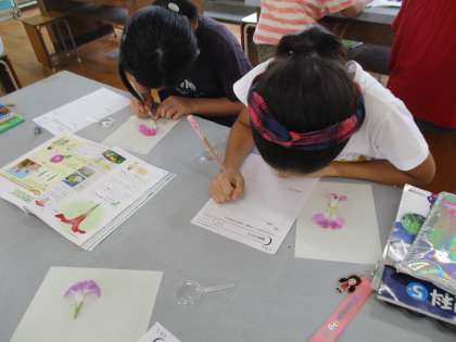 理科で花のつくりについて学習しました。花びらを開いてみると,中には細い線が何本か…虫眼鏡を使ってめしべとおしべも先端まで観察していました。