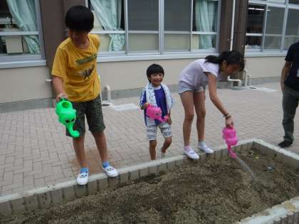 種をまいた後,水をたっぷりやって「大きくなあれ!」「おいしくなあれ!」と声をかけました。