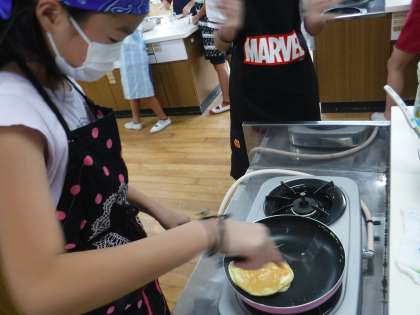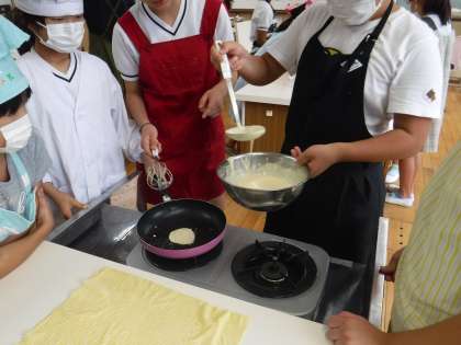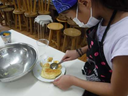 今日のメニューは,「トライフル」ホットケーキを焼いてそれをオレンジジュースにつけます。みかん(缶詰)やフルーツゼリーをトッピング。その上にアイスクリームをのせてできあがり!