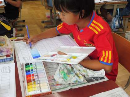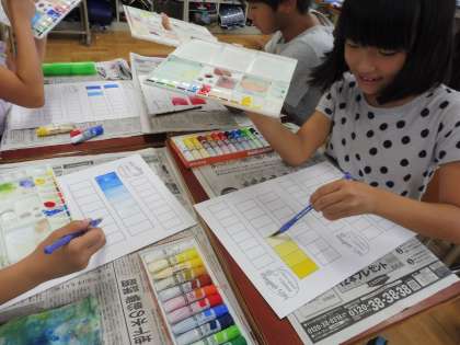 写真は元の色に白色を混ぜてグラデーションを作っているところです。「だんだん白色に近づいてる!!」と言いながら,活動していました。