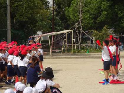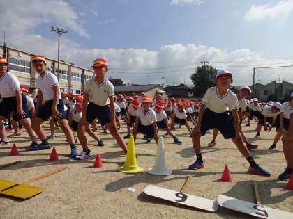 全校練習では,応援の練習,準備運動の練習,頑張っています。