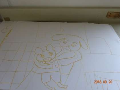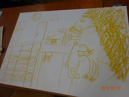 お話を聞いて,自分の好きな場面を絵に表しました。今日は,線描をしました。これから色を塗っていきます。完成が楽しみです。かわいい動物が出てきます。