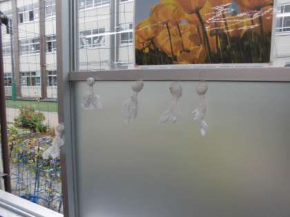 工作係の子どもたちが休み時間にてるてる坊主を作っていました。
