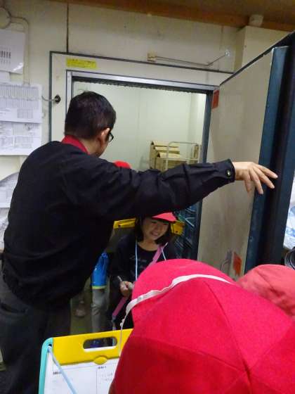 バックヤードの調理の様子や,冷凍庫の中も見せてもらいました。あまりの寒さに慌てて飛び出てきました。
