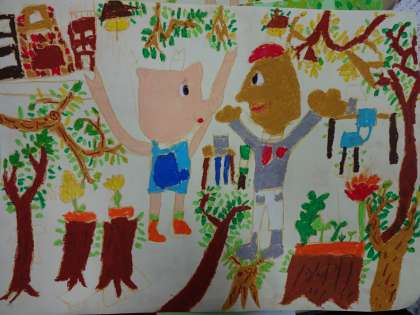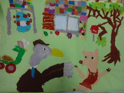 図工の時間,お話を聞いてイメージをふくらまし,絵に表しました。