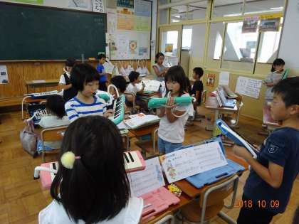 グループでの鍵盤ハーモニカの発表会に向けて,練習に取り組んでいます。課題曲の中から,グループで好きな曲を選んでいます。