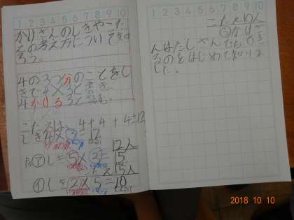 かけ算とは,○のいくつ分のことを式で表します。4の3つ分は「4×3」4かける3と読むことを学習しました。答えは4+4+4で求められることにも気づきました。