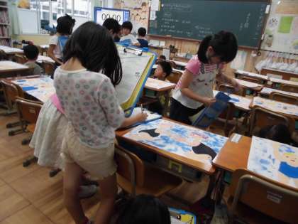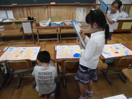 図工の時間に,友だちの作品を見て塗り方や動きの面白いところなど,素敵だと思ったところを見つけました。