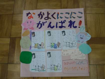 運動場に出るとかわいい園児たちが開会式の練習をしていました。「かわいい!」「あっ,知ってる先生や!」「あっ,○○くん!」と声をかけてもらってニコニコの1年生。みんなで応援メッセージを書いて持って行きました。園長先生に喜んで受けっていただきました。