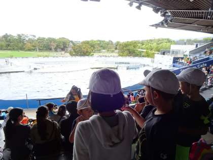 イルカショーでは,イルカのジャンプに大盛り上がり!