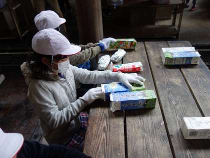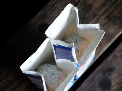 はい。アルミで包んだパンを、牛乳パックに入れます。