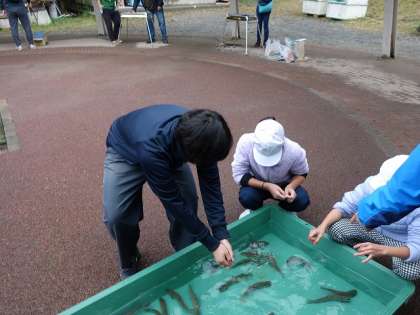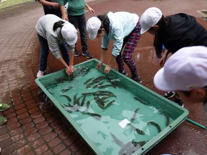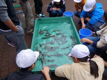 驚いて跳ねる魚にさらに驚く子どもたち。