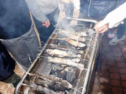 やっとのこと、火がついて、串に刺した魚を焼き始めました。