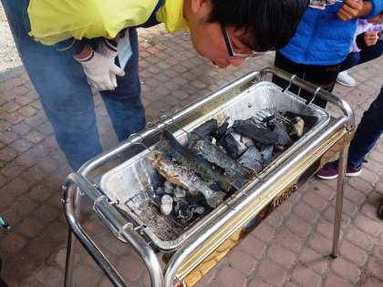 雨が降っているので、炭も湿ってなかなか火が付きません。