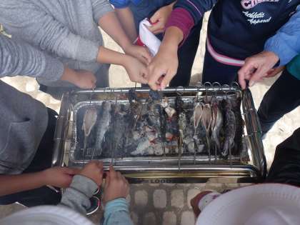 順番に魚を焼いてもらっていますが、そんなにすぐには焼けないので、周りに人が群がっている状態。