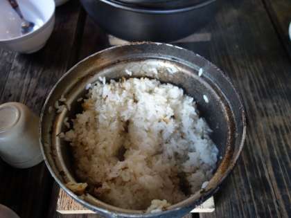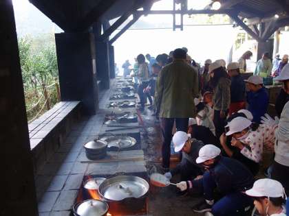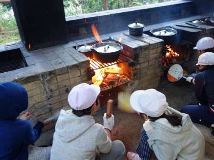 配膳を終えたところもあれば、火と格闘中の班もあり。