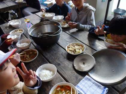 配膳をしているところを見て回っていると、みんなにこにこ顔で配膳をしています。ごはんのおこげも、おいしそうに見えますね。