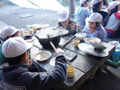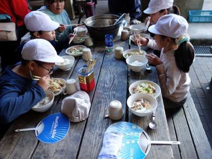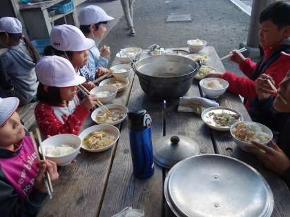 みんな、昨日作った竹のおはしで食べているんですよ。幸せそうな顔をして食べていますよねー。
