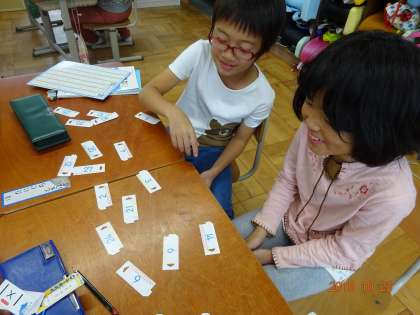 かけざんの九九も5・2.3のだんを学習しました。今日は,九九カードで席が横の子と,九九かるたをしました。「二六(にろく)」と言うと,見つける子が,「12」と書いたカードを探してとります。