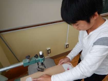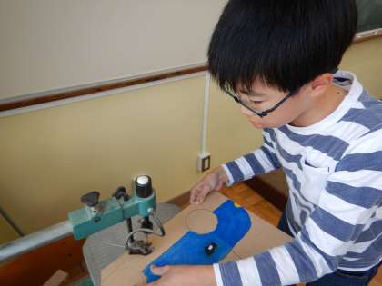 図工では,電動のこぎりを使ってホワイトボードを制作しています。