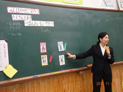 栄養教諭の教育実習生さんに食育の授業をしてもらいました。たくさんとれて,一番おいしい時期を「旬」ということをしりました。この野菜は,どの季節が旬なのかをグループで話し合って,分けていきました。