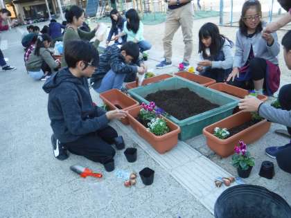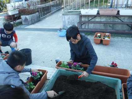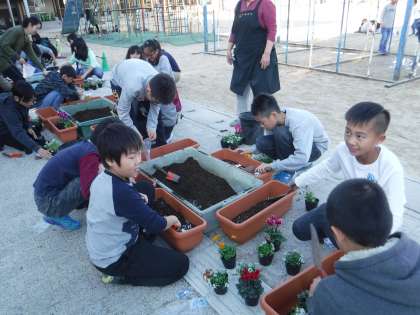 今日の委員会活動では,花育事業部の方が園芸委員会のみんなに寄せ植えを教えていただきました!みんな植え方の説明を聞いて取り組みました。