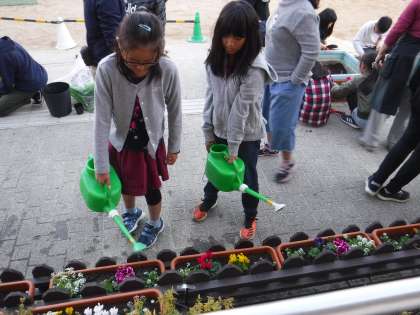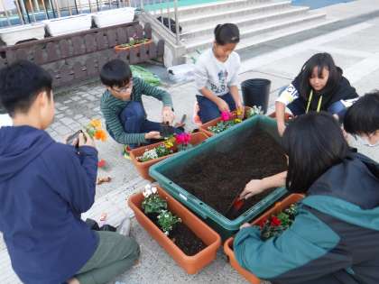 花育活動で素敵な寄せ植えをしました。「毎日水やりはしないで土が乾いたらしてくださいね。」と明日からの水やりの仕方も教えていただきました。5月ぐらいまできれいな花を楽しめます。ありがとうございました。