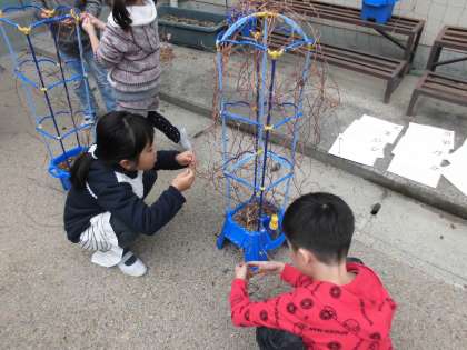 夏に育てたアサガオのツルを使って,リースを作りました。
