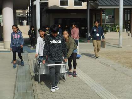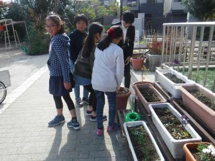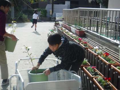 今日は,園芸委員会で「しだれ梅と生茶に使う茶葉の木」を校門前に移動しました。先日の花育のお花と梅ノ木やお茶の木で校門前は,にぎやかになりました。重たい植木を台車で運びました。