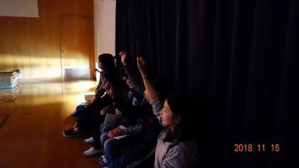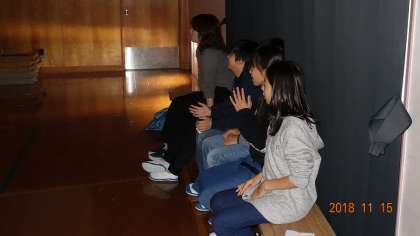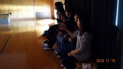 これは,4年生のふりを付けながらの合唱を聞いている6年生たち。幕間の係なんですが,4年生の振付を完コピ。4年生の歌に合わせて,一緒に唄いながら振付をしています。