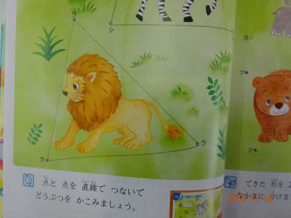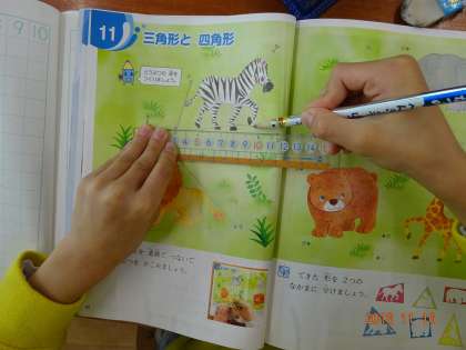 今日から「三角形と四角形」の学習を始めました。3本の直線で囲まれている形を三角形ということや,4本の直線で囲まれている形を四角形ということを知りました。