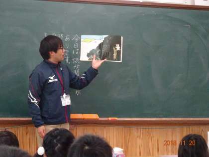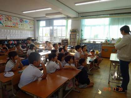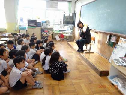 もみじ読書週間で,違う学年の先生に読み聞かせをしてもらいました。