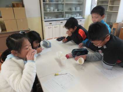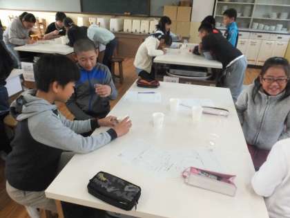 4つの出汁を味見したり,においを嗅いだりして