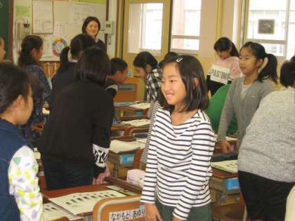 「上手にできてるよ」と川内先生の声に思わずにっこりの子供たちです。