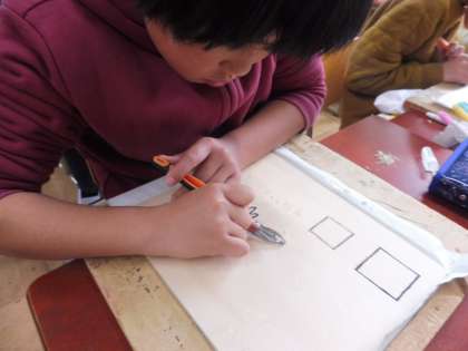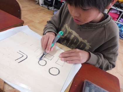 図工科で木版画の学習をしています。4年生は彫刻刀を使っての初めての版画の学習です。まずは,線に沿ってきれいに彫る練習♪