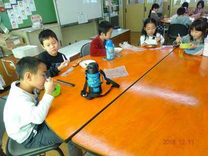 昨日,収穫した大根を,今日はみんなで食べました。大根葉も塩茹でして食べました。「おいし〜」「こんな味なんや〜」と言っていました。
