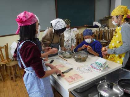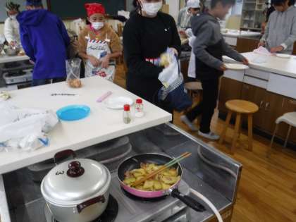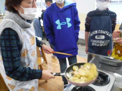 今日作るのは「ジャーマンポテト」でした。材料は,じゃがいも・玉ねぎ・ベーコンです。最初にじゃがいもをゆがいてそのあと玉ねぎやベーコンゆがいたじゃがいもをサラダ油で炒めて塩・コショウで味付けをしました。「先生!フライパンをふって見せて!」とO先生は「するよ!」とフライパンをプロのような腕前を見せてくださいました。さすが!です。