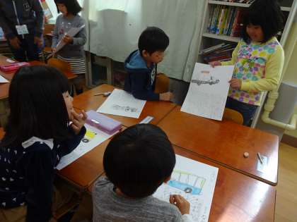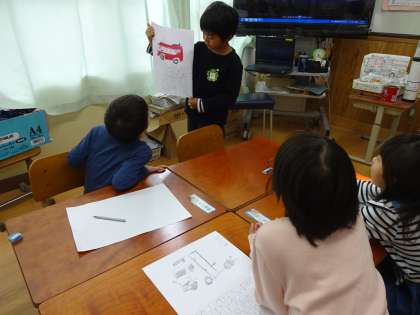 国語科の学習で「じどうしゃくらべ」を読み,しごととつくりを見つけました。
