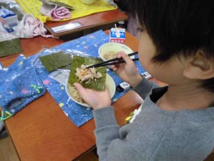 のりの上にご飯をのせてまいていきます。上手にできるかな??
