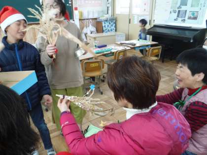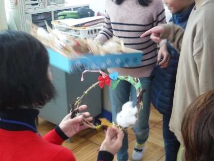 さつまいものつるやふじのつる,とうもろこしの花と茎でクリスマスのリースやスワッグを作ったのでプレゼントしました。もこもこさんのみなさんに喜んでもらえて嬉しかったです。今年もありがとうございました!来年もよろしくお願いします!