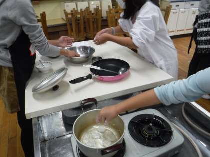 今回は,「みたらしだんご」を作りました。だんごの粉を水でといて丸めてお湯の中に入れます。浮いてきたら水の中にとって器にわけます。