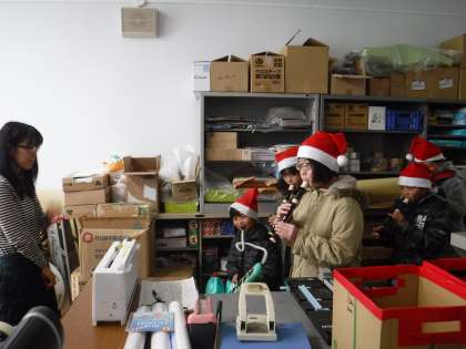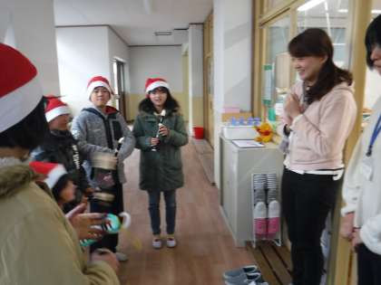 いつもお世話になっているところへ感謝をこめて「メリークリスマス!」リコーダーと鍵盤ハーモニカで「ジングルベル」の演奏を聴いてもらっています。手作りの飾りもプレゼントしました。まずは,保健室と事務室に行きました。