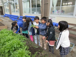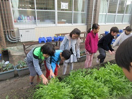 子どもたちは,手を泥だらけにしながら,1つ1つ大切に水菜を収穫しました。