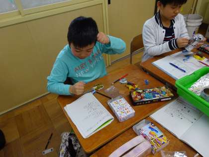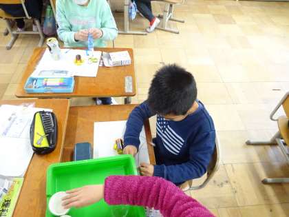理科「豆電球に明かりをつけよう」の単元に入りました。電池と豆電球で回路を作り,明かりがついたときは大喜びでした。また,電気を通すものと通さないものを調べて色々な発見がありました。