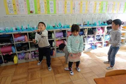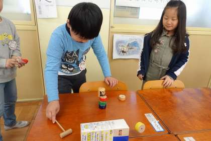 けん玉やだるま落とし,お手玉など,たくさんの遊びに挑戦しています。