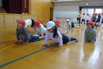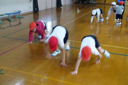 体育の学習では,3クラス合同でまねっこ遊びをしました。