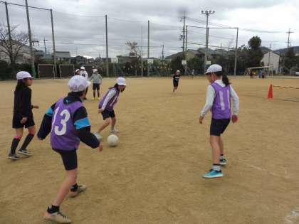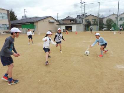 体育でサッカーの学習をしています。チームごとにパスをつなぐにはどうすれば良いか工夫しながらがんばっています。