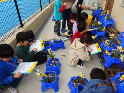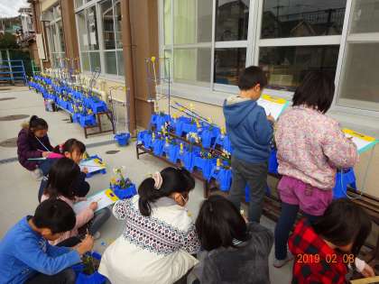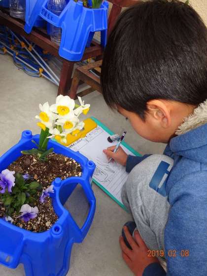 秋に植えた球根が,生長して,きれいな水せんの花が咲きました。触ったり,長さを測ったり,数を数えたりして観察しました。