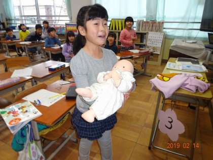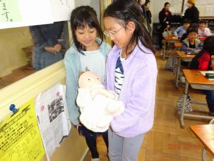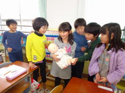 学活の時間に,「ぼく・わたしが生まれるまで」という学習をしました。最後に,約3キログラムの赤ちゃん人形を抱っこしました。「結構重いなぁ。」や「首がグラグラ・・・。」という声が出ていました。
