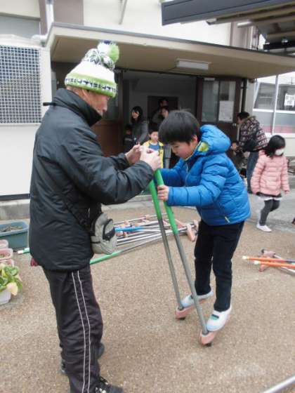 竹馬名人に支えてもらいながら一歩一歩歩いています。
